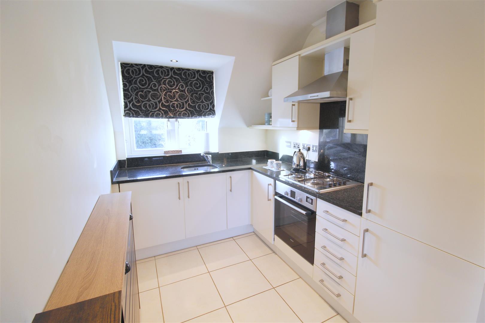 High specification kitchen with modern white gloss eye and base level cupboards, black granite worktop, integrated appliances including dishwasher, washer/dryer and tall fridge freezer. Electric built in oven with gas hob and extractor fan. Large double glazed window with front aspect situated by the stainless steel sink and mixer tap, radiator, wooden shelf and tiled floor.