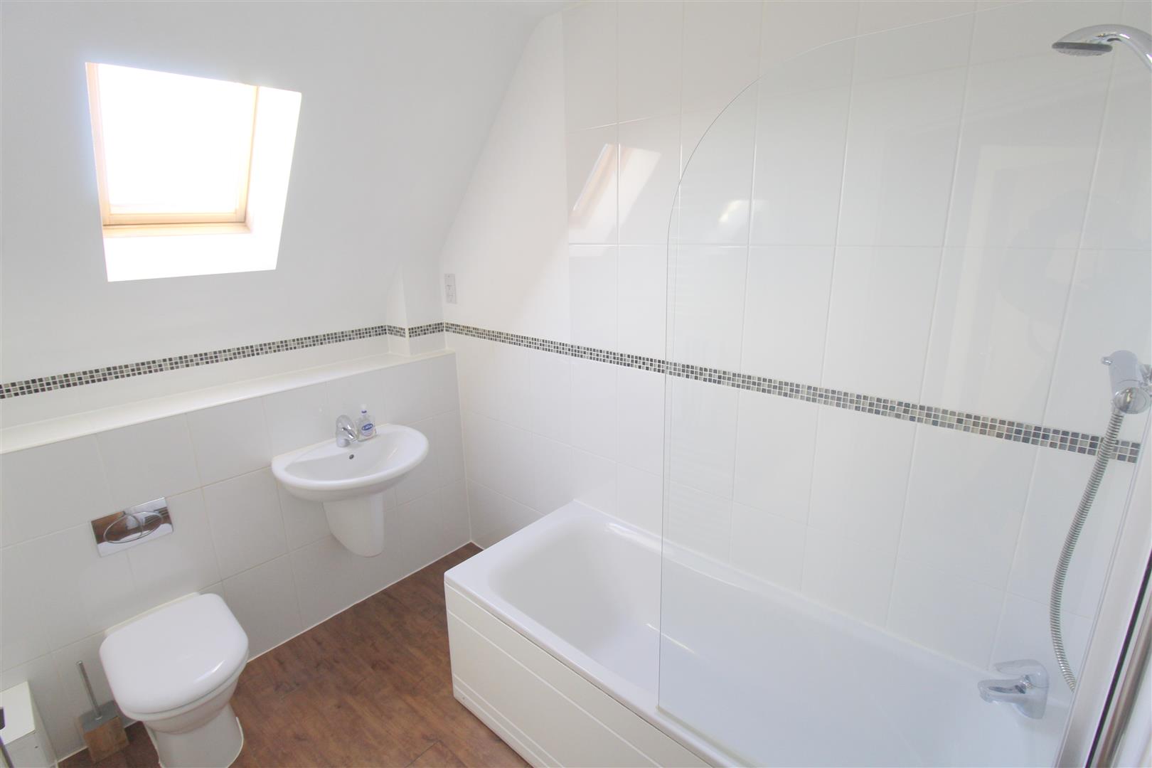 Modern, white bathroom suite comprising of a large panel bath with chrome mixer taps and power shower over bath, shower screen, tiled floor, double glazed velux window, built in low level toilet and floating hand basin, white tiles with mosaic border and vinyl wood effect floor.