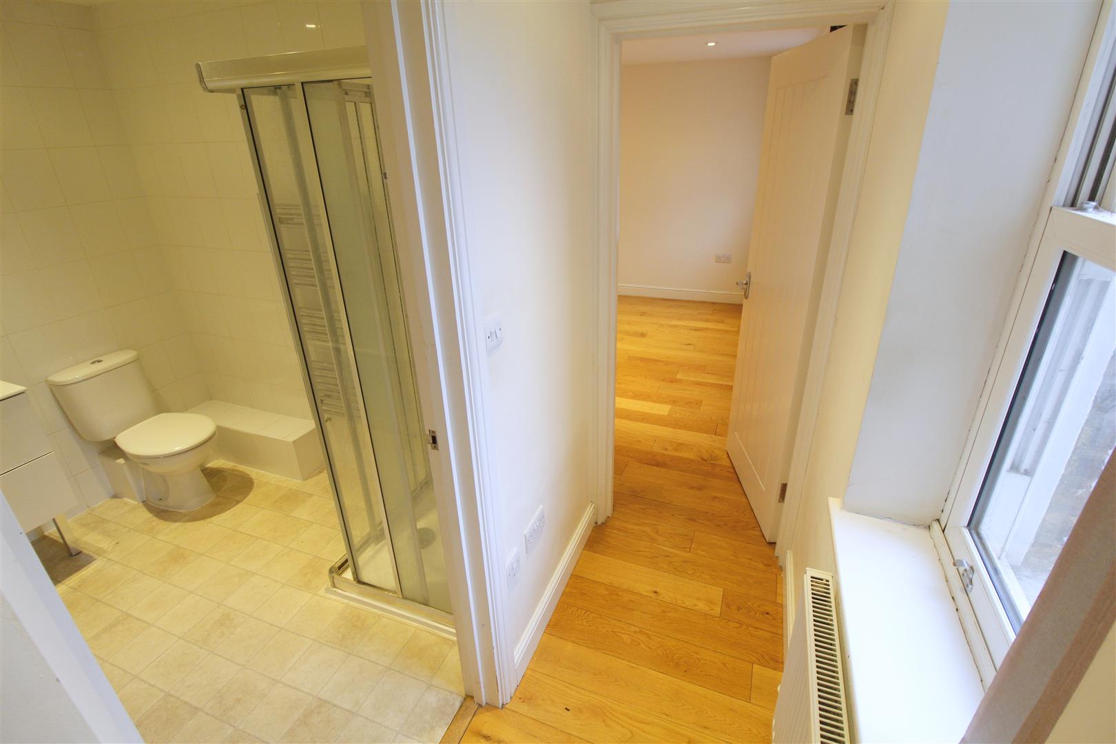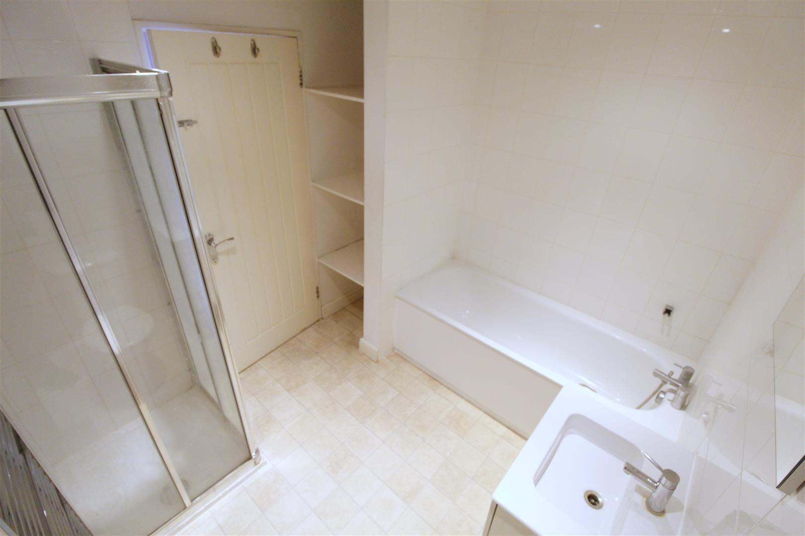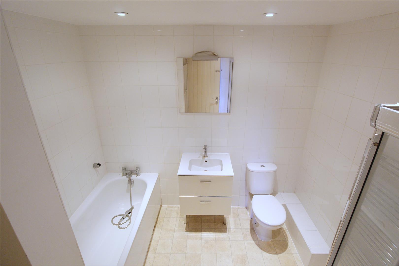White bathroom suite comprising of a panel bath with hand held shower hose, floating hand basin with drawers, low level toilet and shower enclosure with moonson shower head. Vinyl flooring, down lights and extractor fan.