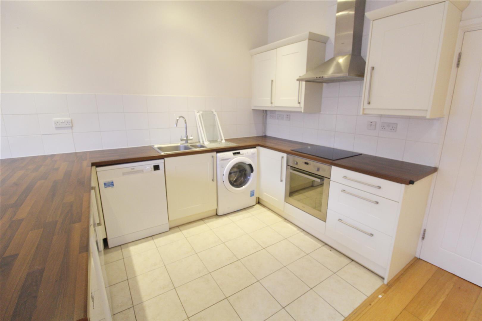 Matching cream eye and base level cupboards, formica worktop creating a breakfast bar and tiled splash back. Four burner induction hob, electric oven, extractor fan, free standing; washing machine, dishwasher and under counter fridge and freezer. Tiled floor, down lights and open plan to the lounge.