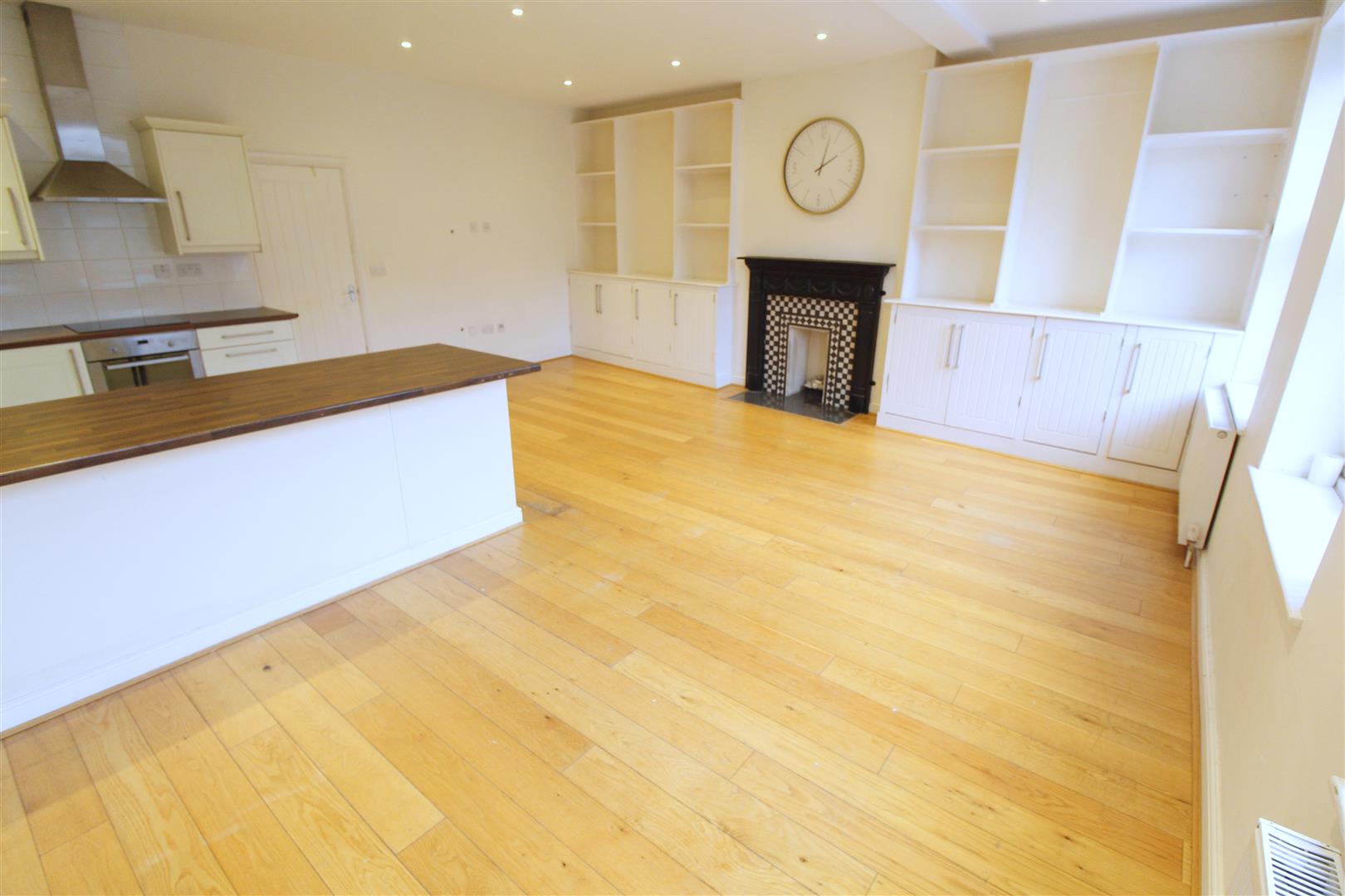 Light and bright lounge with three double glazed sash windows, solid wood floor, storage shelves, tall ceilings, down lights, radiators and ornate fireplace with wood surround. Open plan to the kitchen.