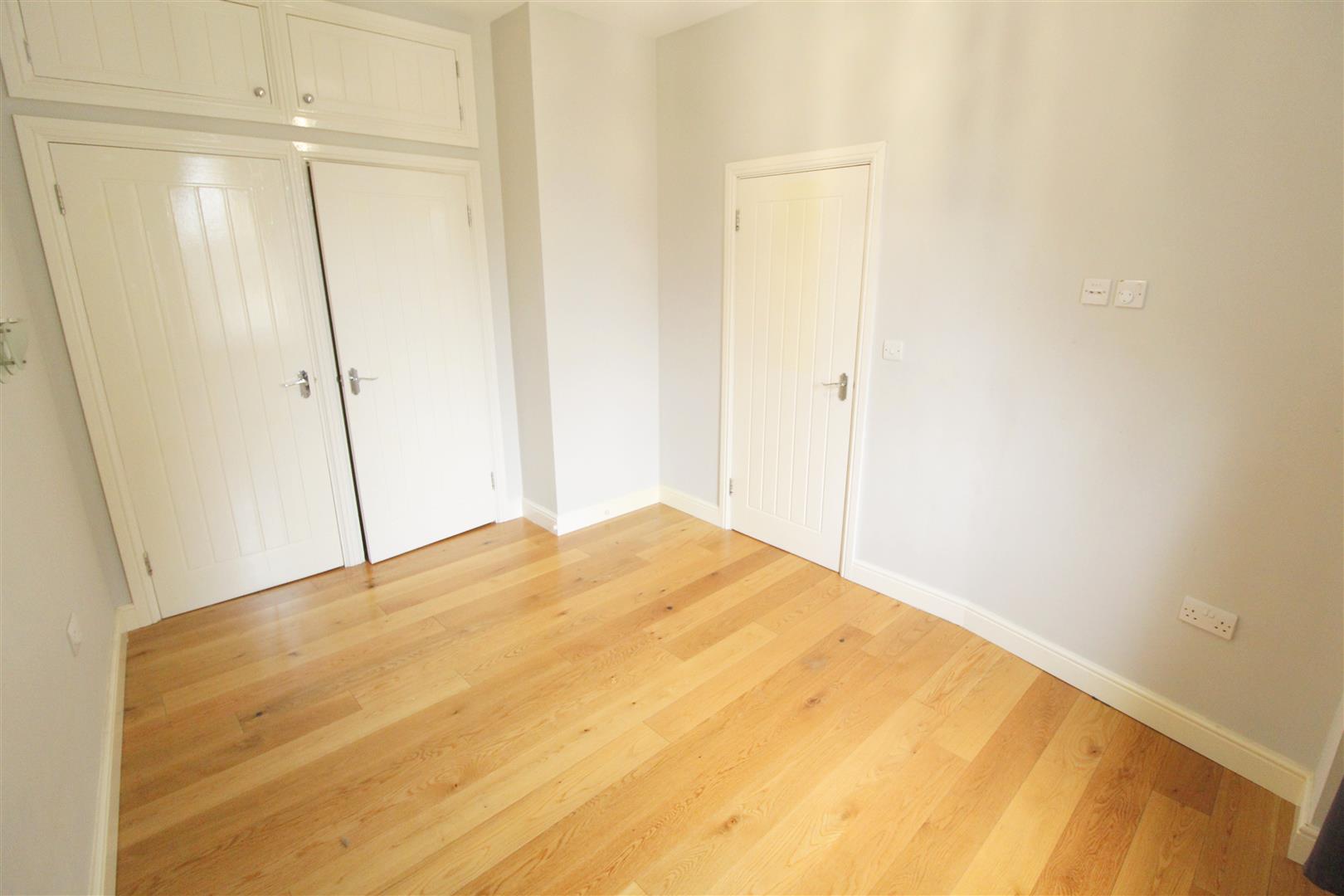 Double bedroom with a large built in wardrobe and further cupboard, wall and ceiling light, solid wood floor, radiator and double glazed window overlooking the rear of the building.