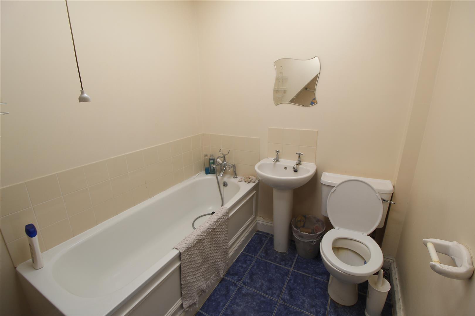 Family bathroom with a matching white bathroom suite comprising of a panel bath, low level toilet and hand basin on a pedestal. Velux window, tiled floor and towel rail.