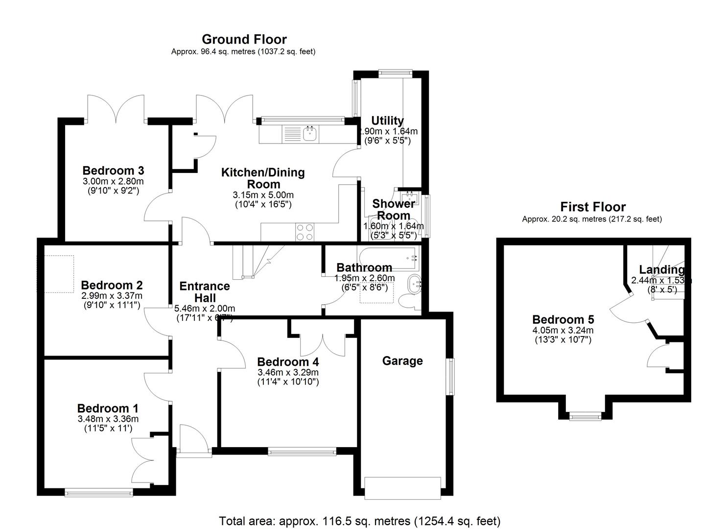 Washing machine, tumble dryer, sink with drainer, double glazed window and door to the shower room.