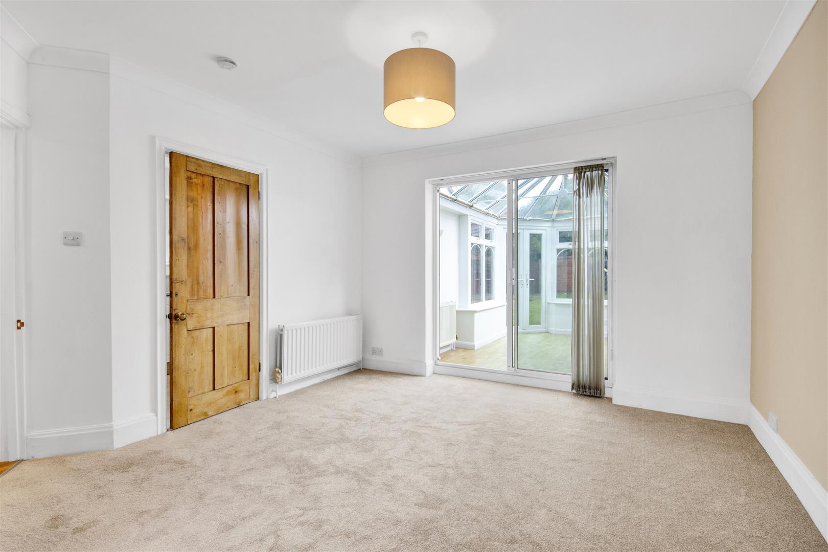 Spacious dining area suitable to accommodate a large dining table and chairs. Central ceiling light, radiator and patio sliding doors leading to the conservatory.
