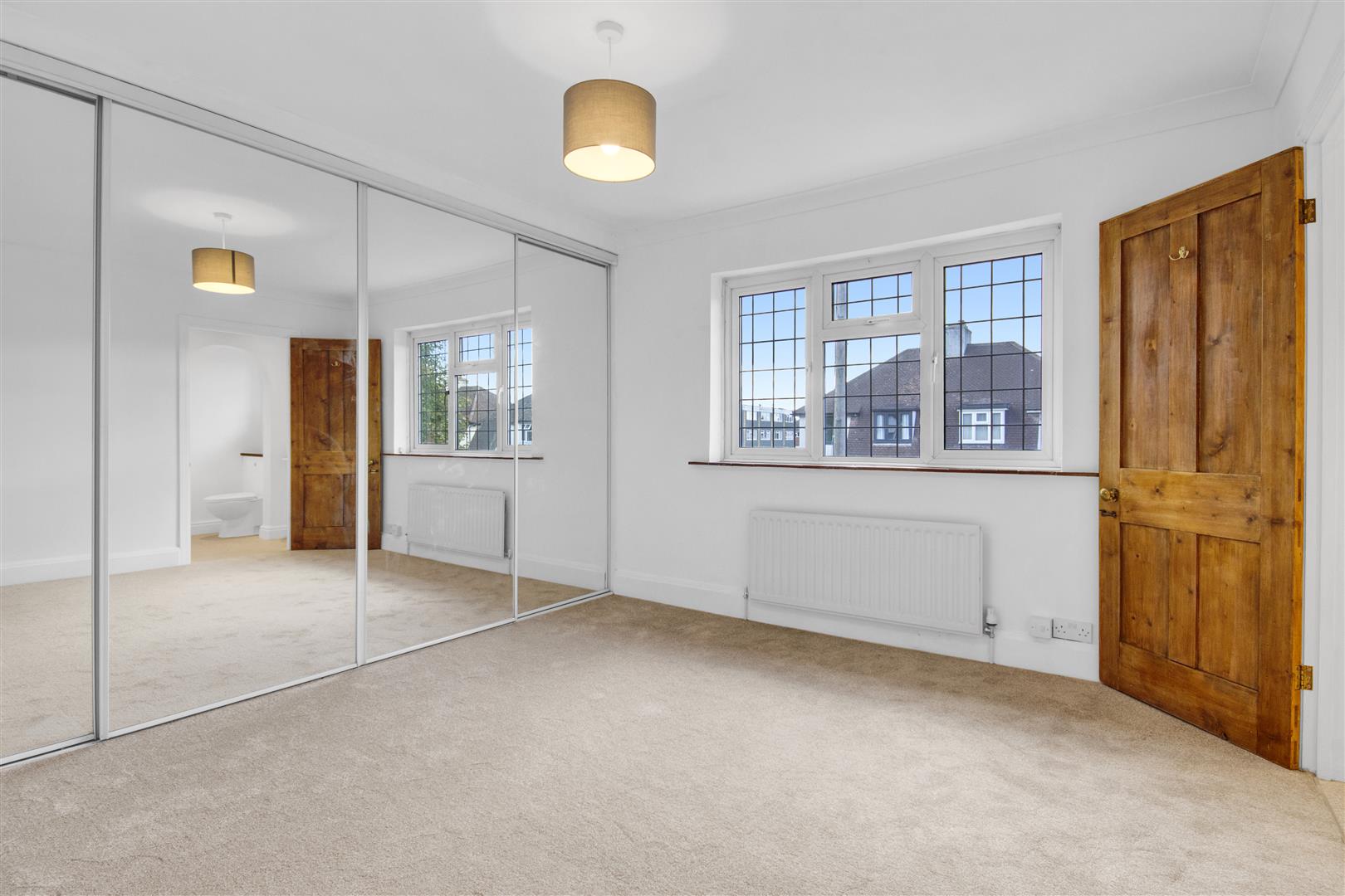 Spacious master bedroom with a wall of fitted mirrored wardrobes, double glazed window overlooking the entrance, carpet, central ceiling light and radiator. Door leading to the en-suite.