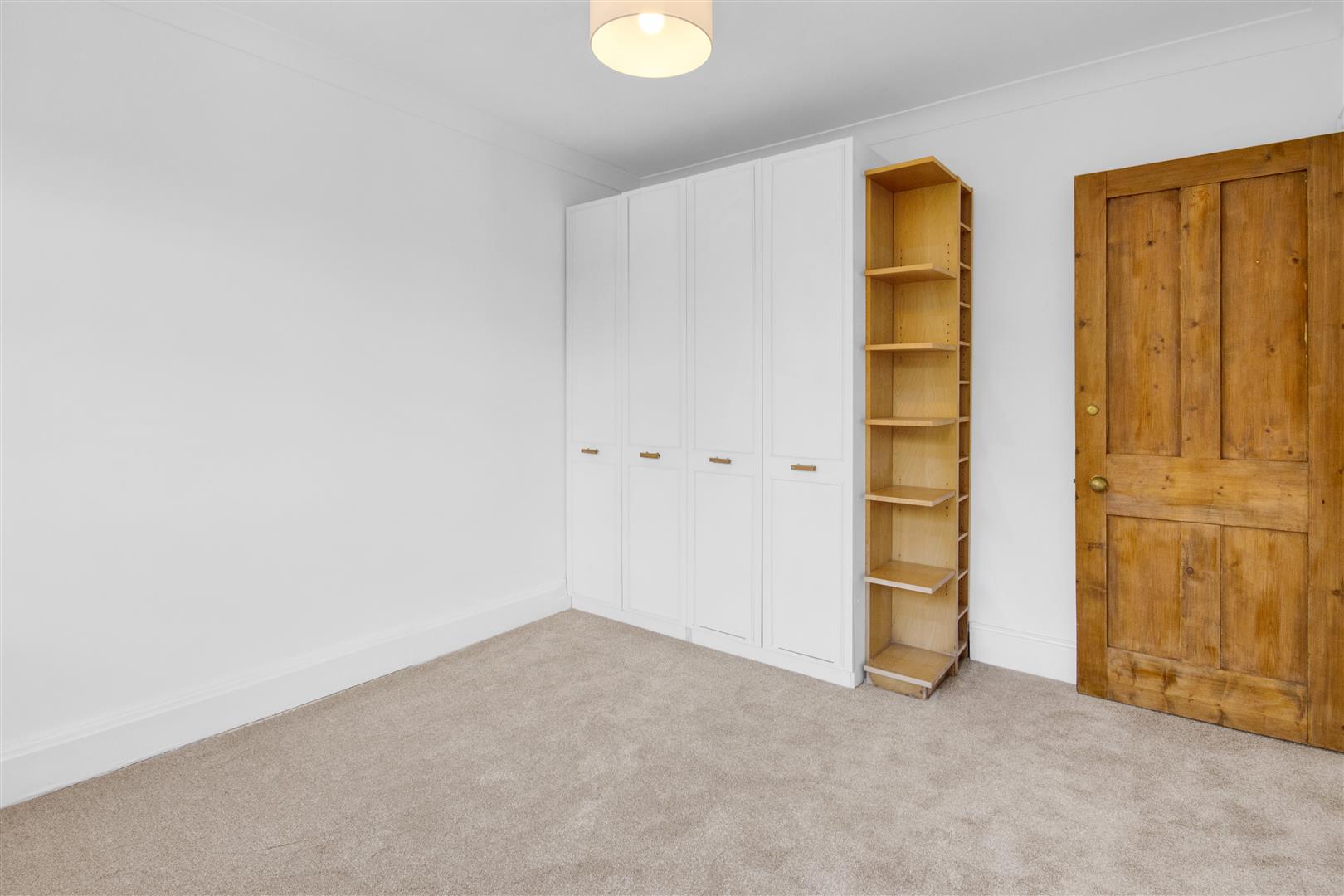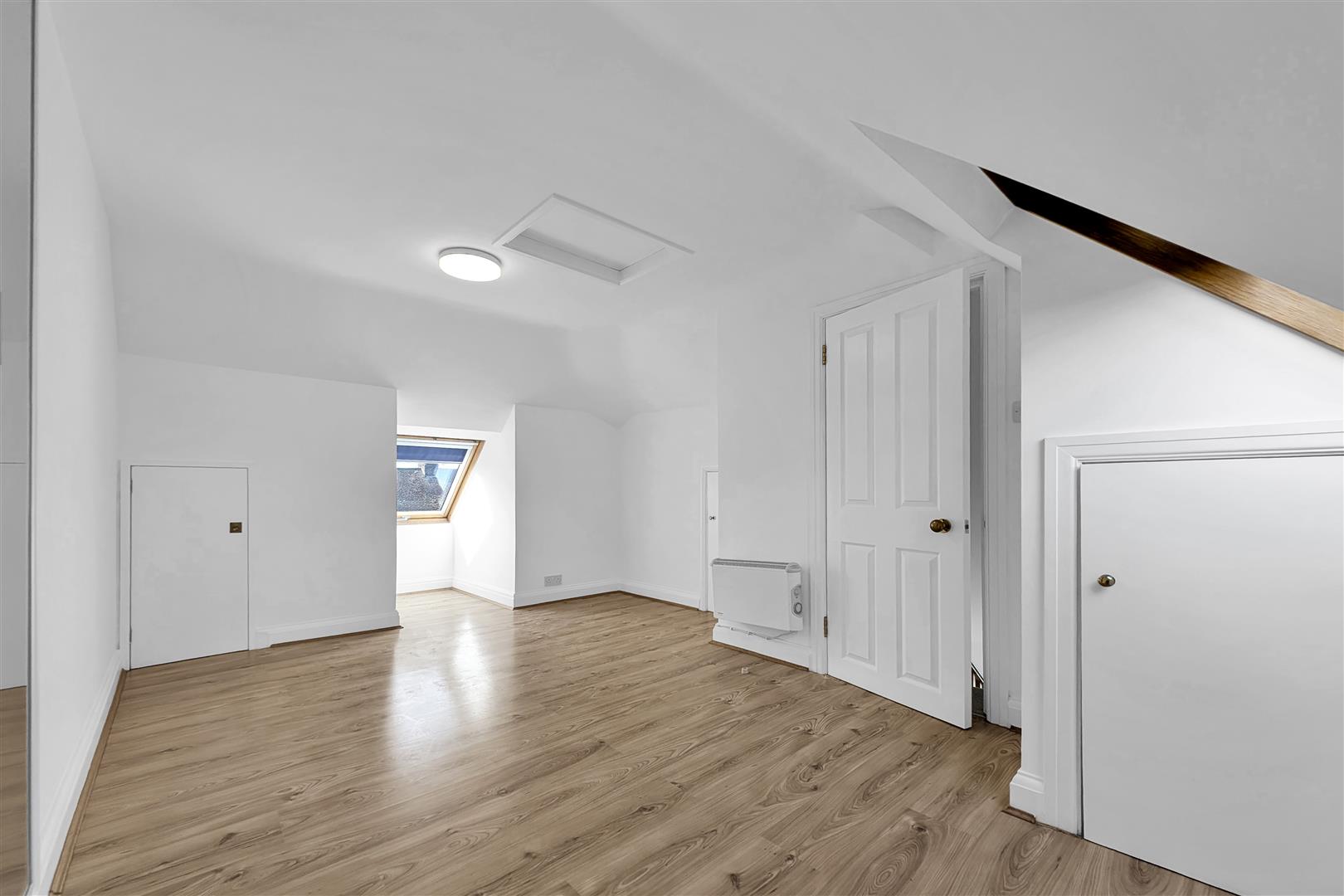 Double bedroom benefitting from two double glazed velux windows, three walk-in eaves storage cupboard, carpet and a built in single wardrobe with frosted glass.