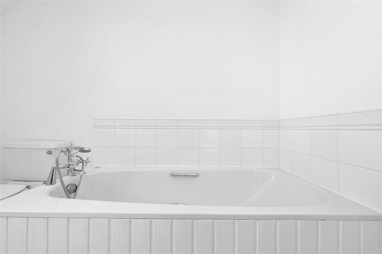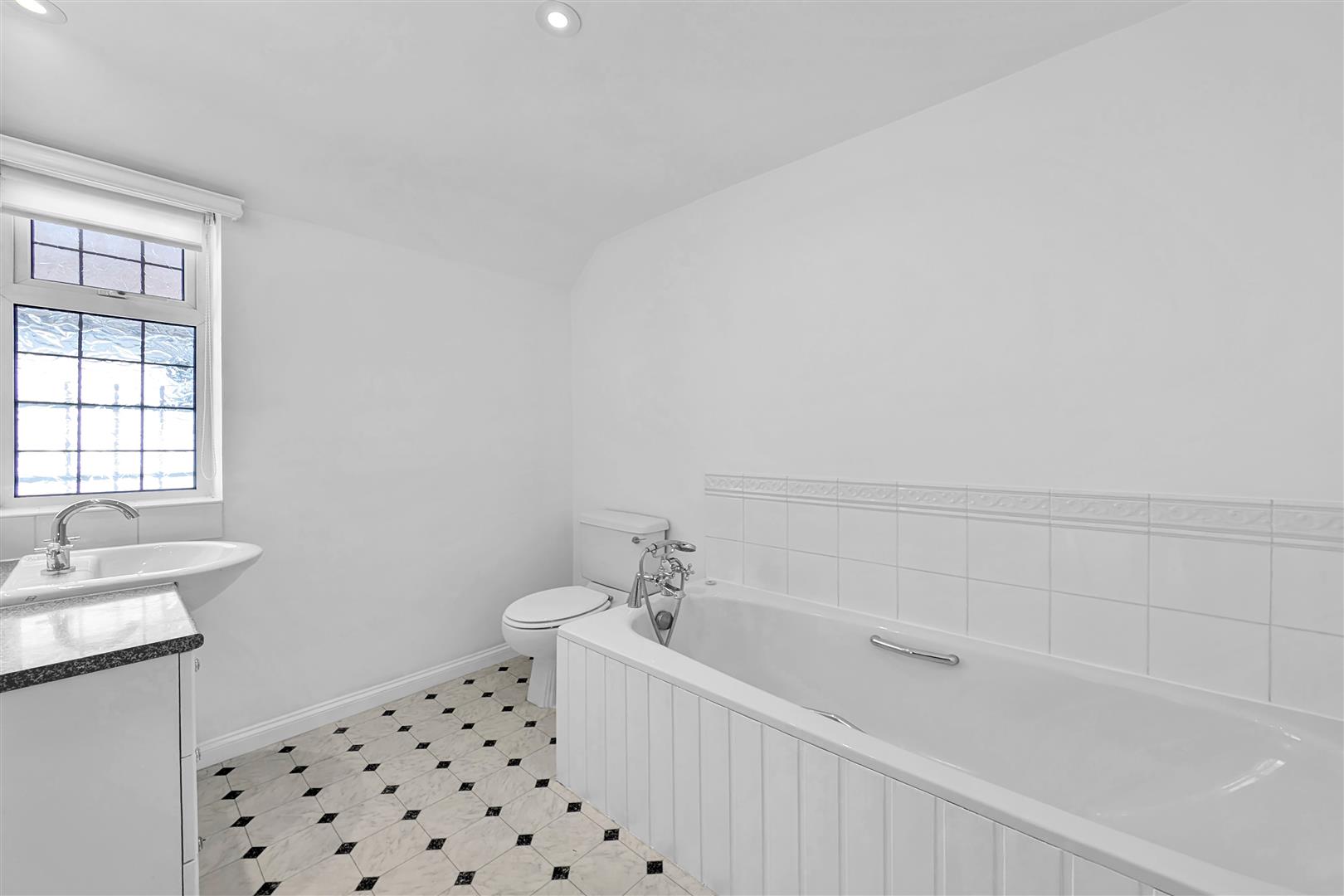 Generous size bathroom with a white suite comprising of a large panel bath and chrome mixer taps, part tiled wall, low level toilet, hand basin built in to a vanity unit, white towel rail, down lights, vinyl floor and double glazed window with obscured glass.