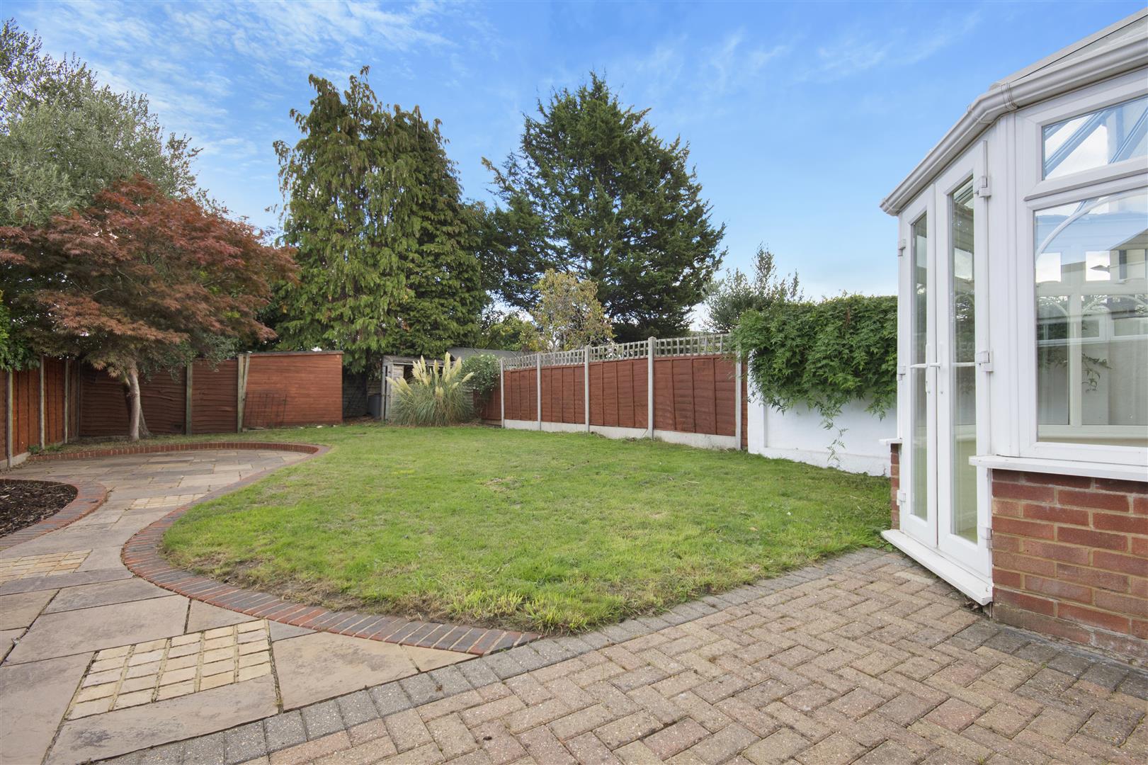 Landscaped, sunny garden mostly laid to lawn with a sweeping block paved footpath and patio area, outside tap, mature shrubs, two large storage sheds and wide access to the front.