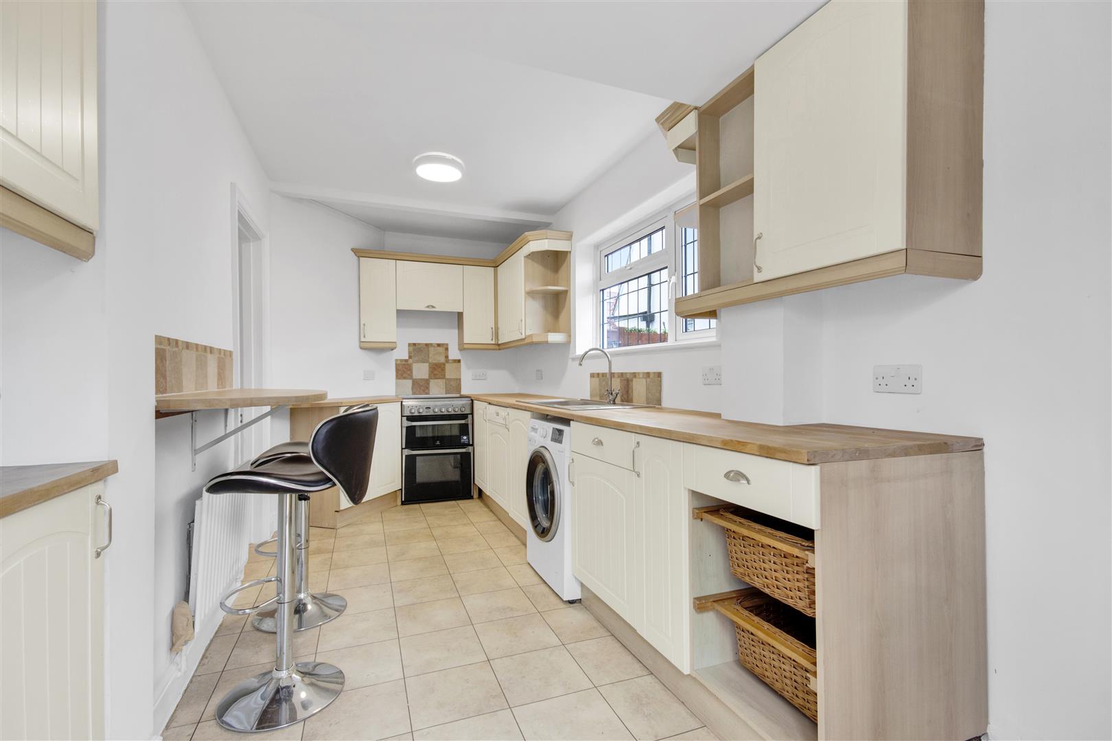 Well designed kitchen situated at the rear of the property with a vast amount of cream eye and base level cupboards, formica work top, space for a cooker, tall fridge freezer and washing machine. Integrated dishwasher, stainless steel sink and drainer below the double glazed side aspect window, tiled floor, UPVC rear door leading to the garden, Glow-Worm boiler discreetly positioned in a cupboard, tiled floor and ceiling light.
