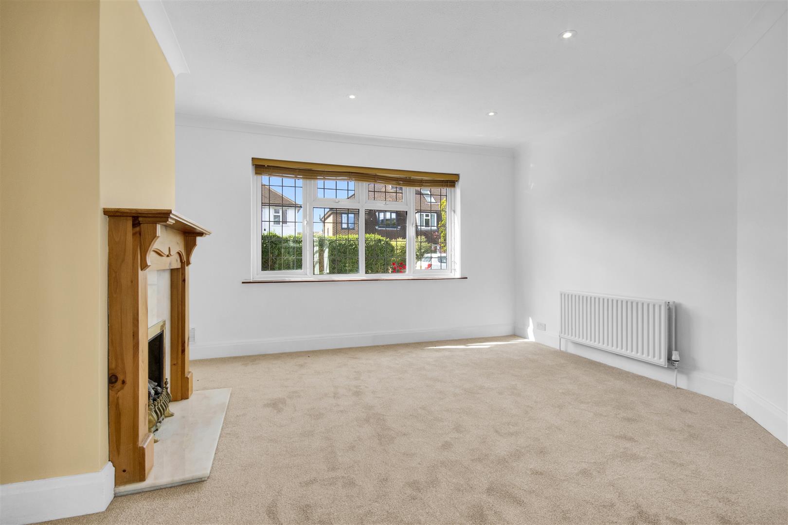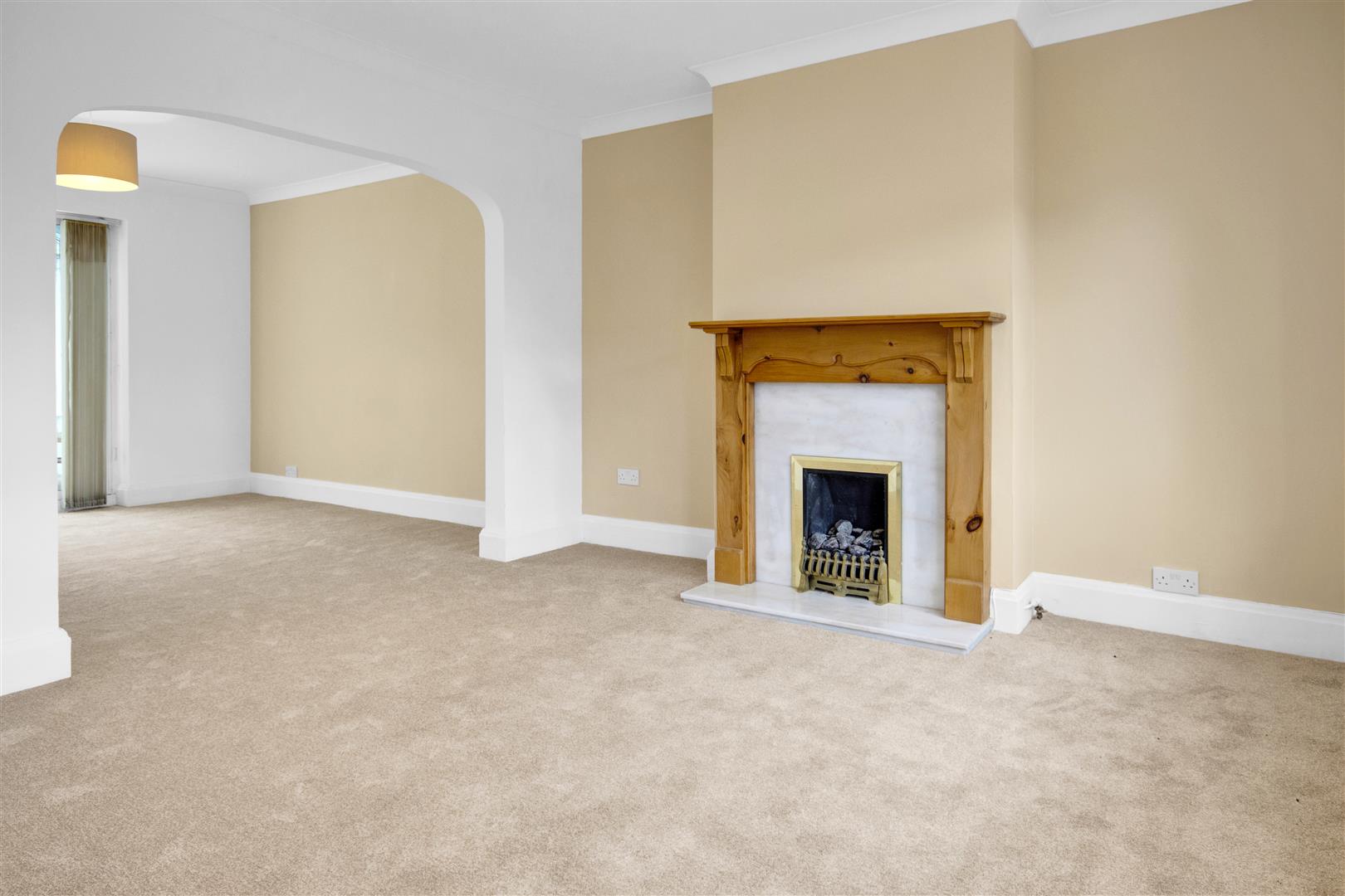 Light and bright lounge with new carpet, radiator, down lights, double glazed window, gas fire with marble surround and wooden mantelpiece, archway leading to the dining area.