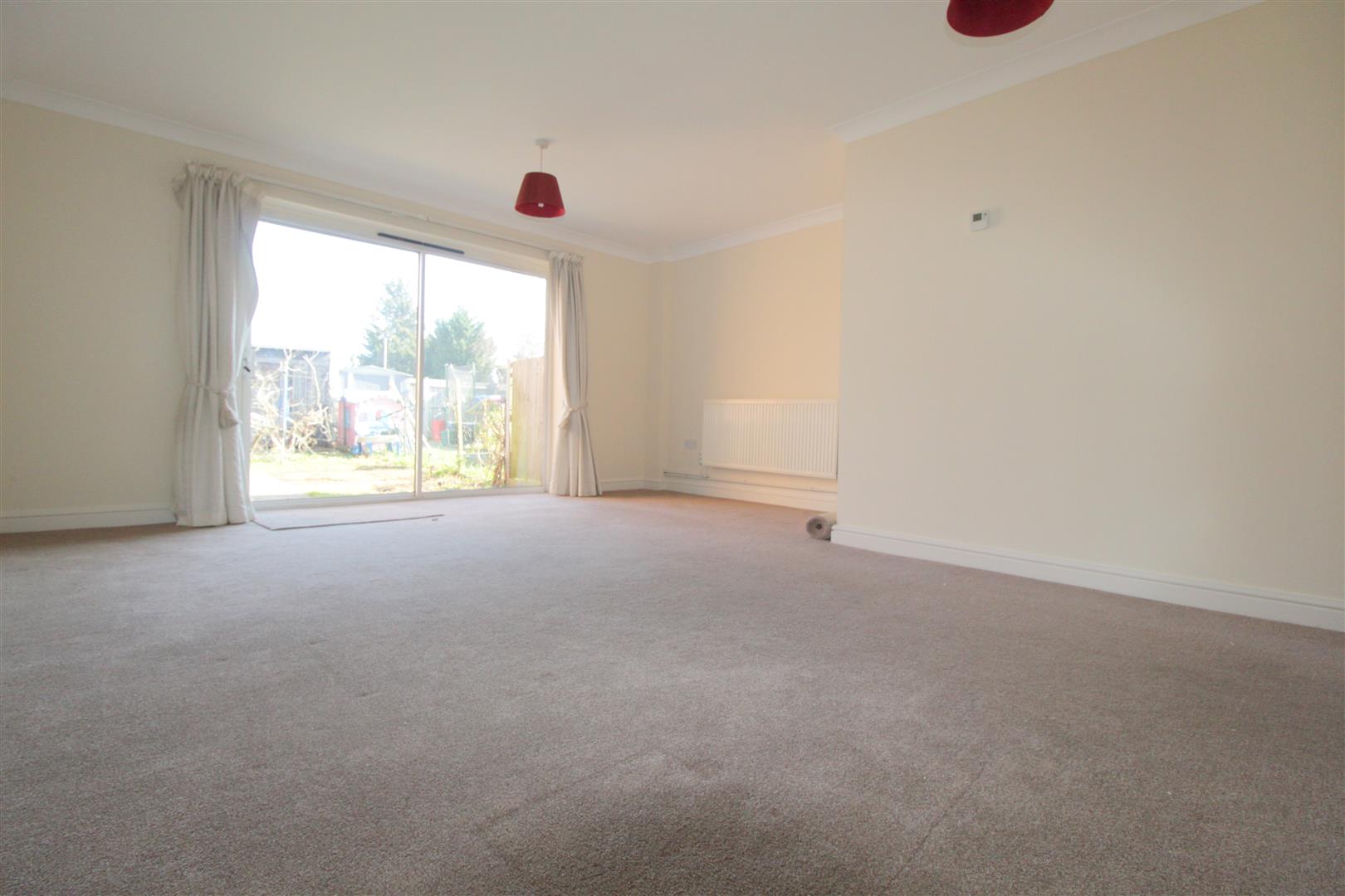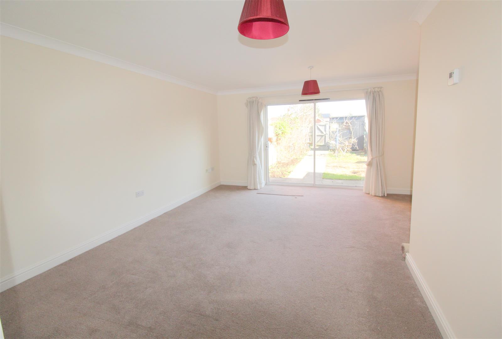 Spacious sunny lounge, fitted carpets, double glazed patio door with stunning view of enclosed rear garden. Thermostat, radiator, coving, two ceiling lights with light shade, and curtains. Ample electric sockets and overall a commodious lounge offering generous space for furniture.