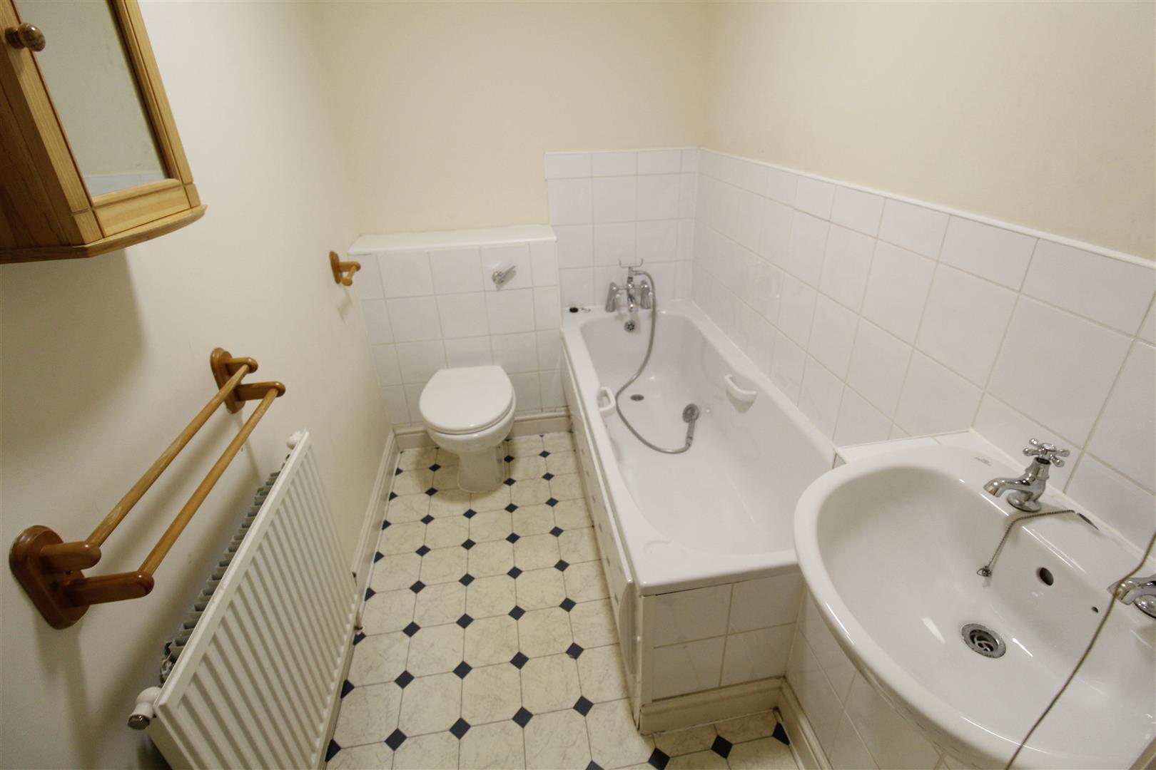 Good size bathroom with a bath that comes with a shower attachment, hand basin and toilet. Partially tiled walls,. vinyl flooring, radiator, air vent, shaver point and towel rail.
