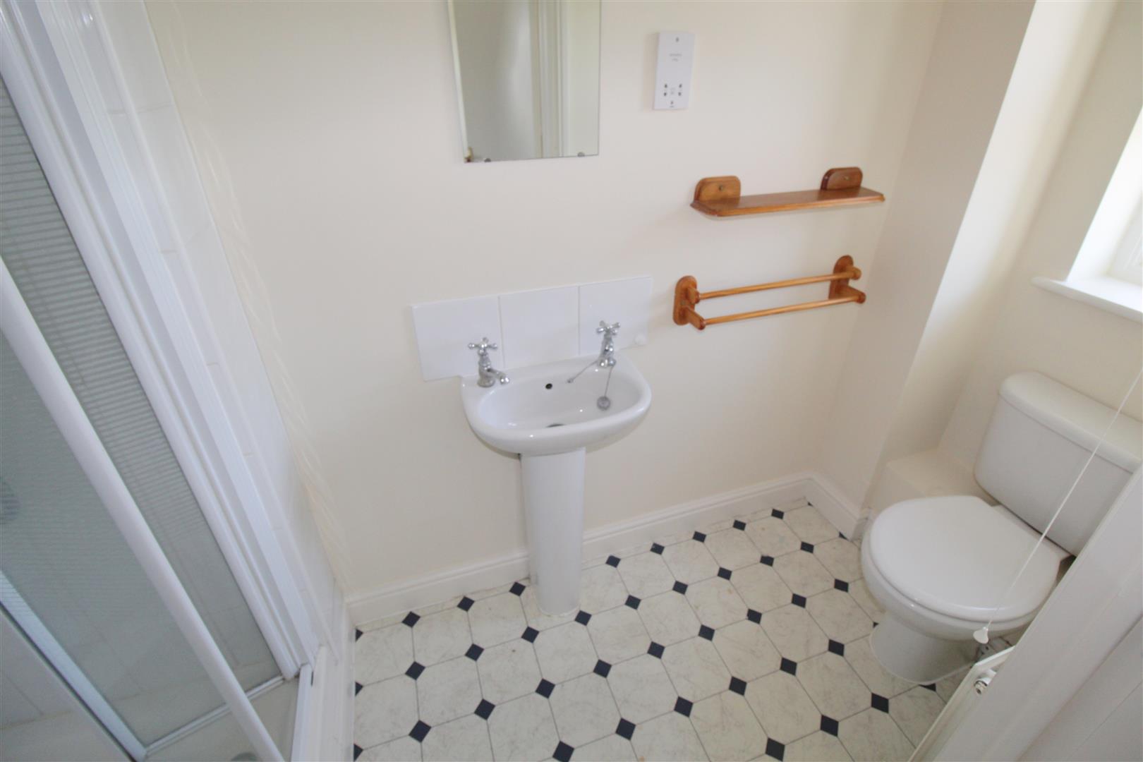 Built in shower cubicle, vinyl flooring, toilet and hand basin, double glazed window with obscured glass. Central ceiling light, radiator, wooden towel rail, air vent, and shaver point.