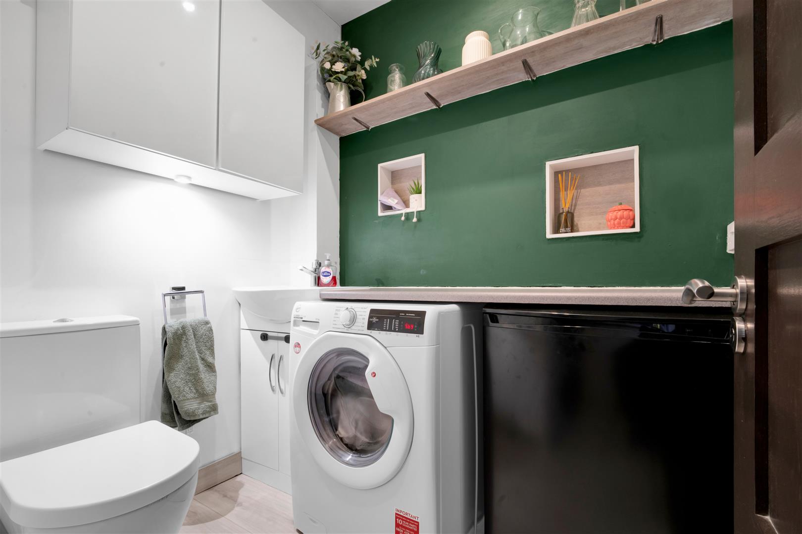 Laminate light grey flooring, low level toilet, hand basin built into a vanity unit, further cupboards, Glow-Worm boiler, down lights and space for a washing machine and tumble dryer.