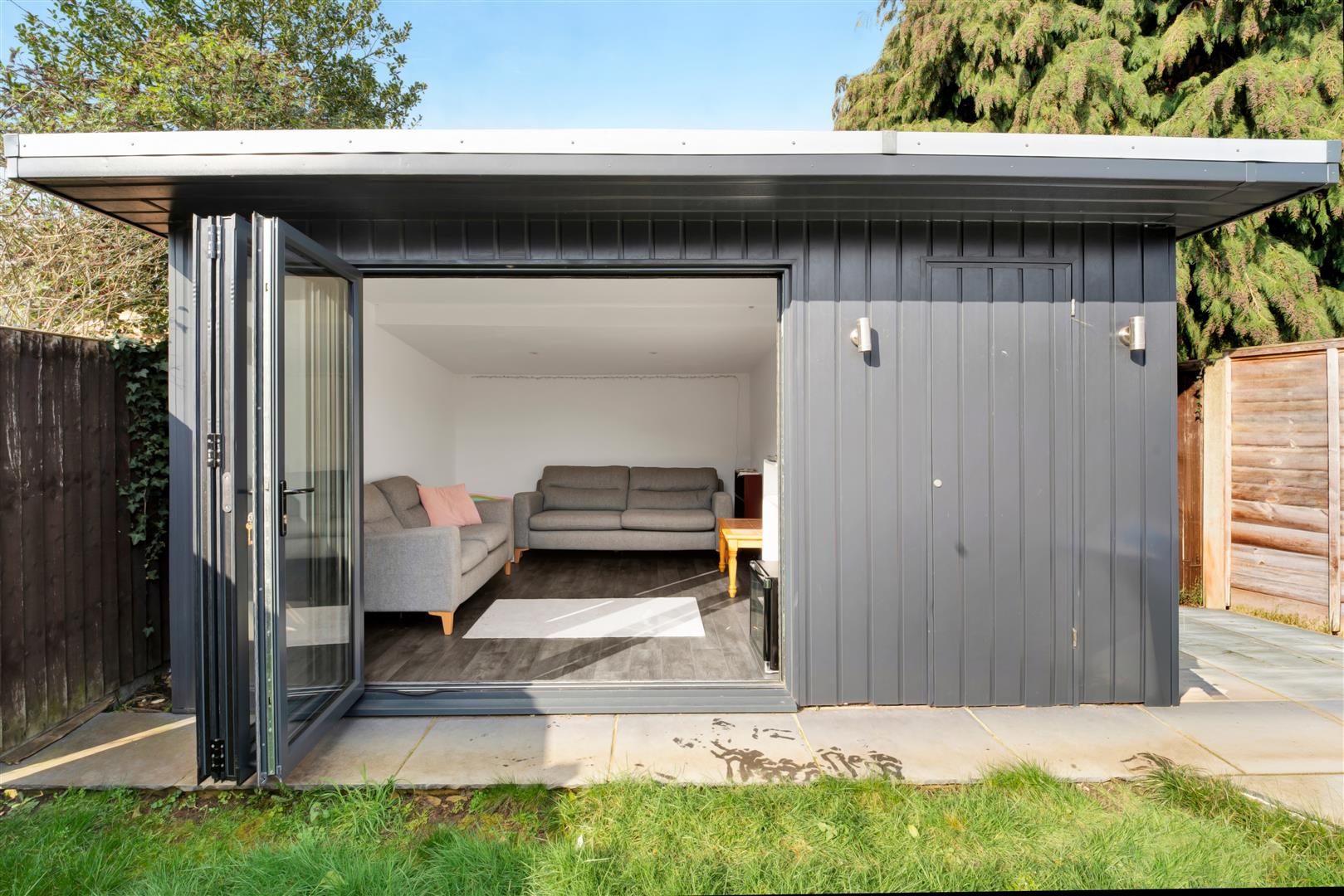 Modern summer house with bi-fold doors, fully insulated, light and power. Ideal for an office or gym. Further storage for garden tools.
