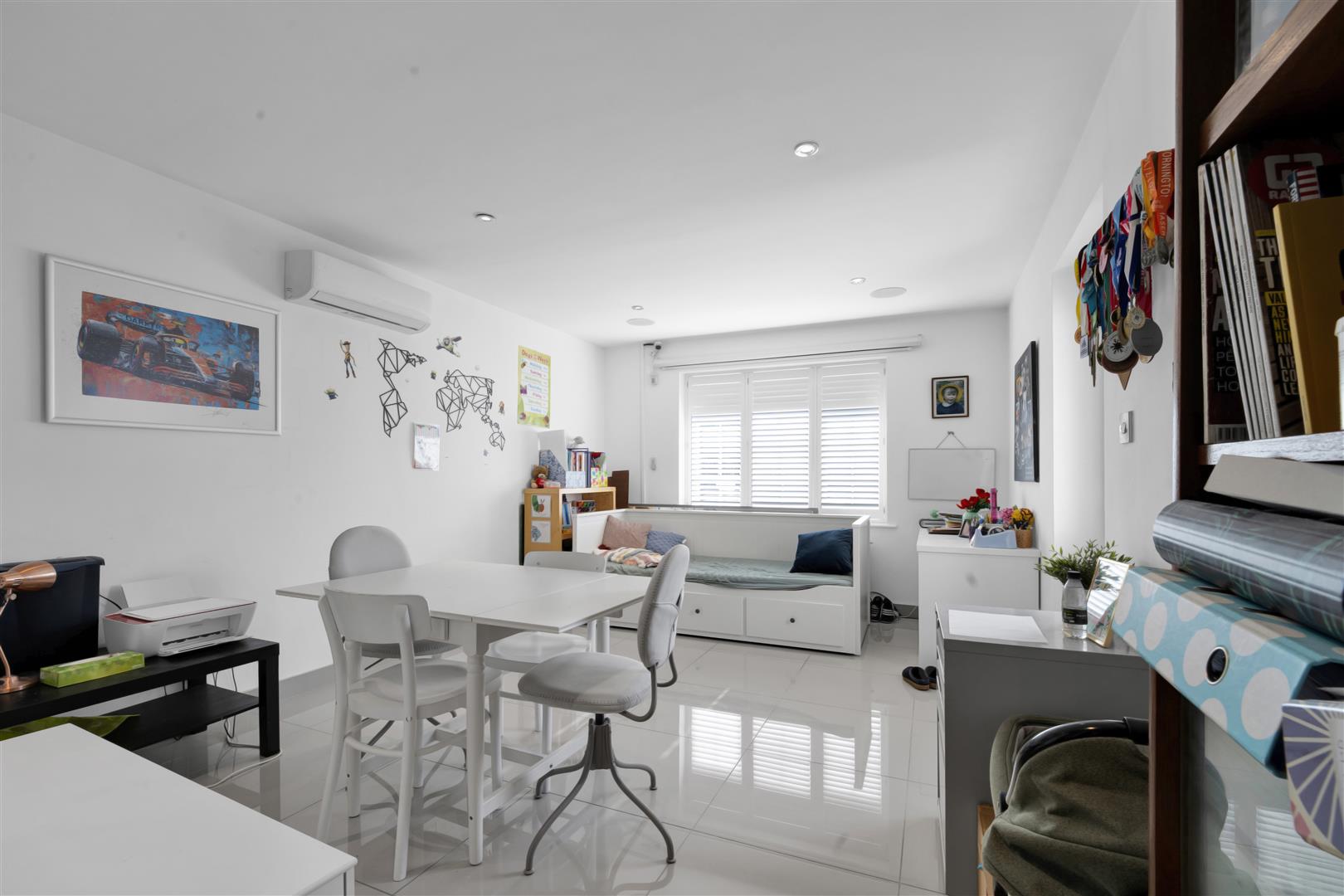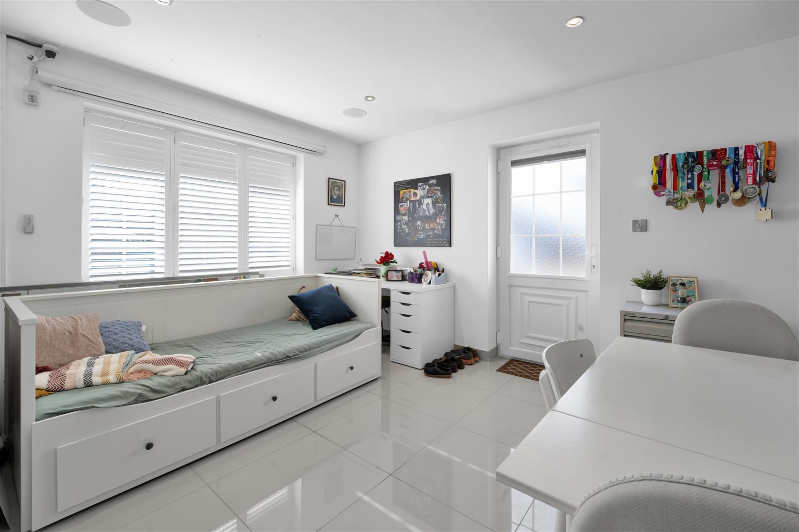 This versatile room benefits from being accessed via the driveway or internally with door leading to the garden. Porcelain tiled floor, air conditioning, down lights, double glazed window with shutter blinds and walk in storage cupboard