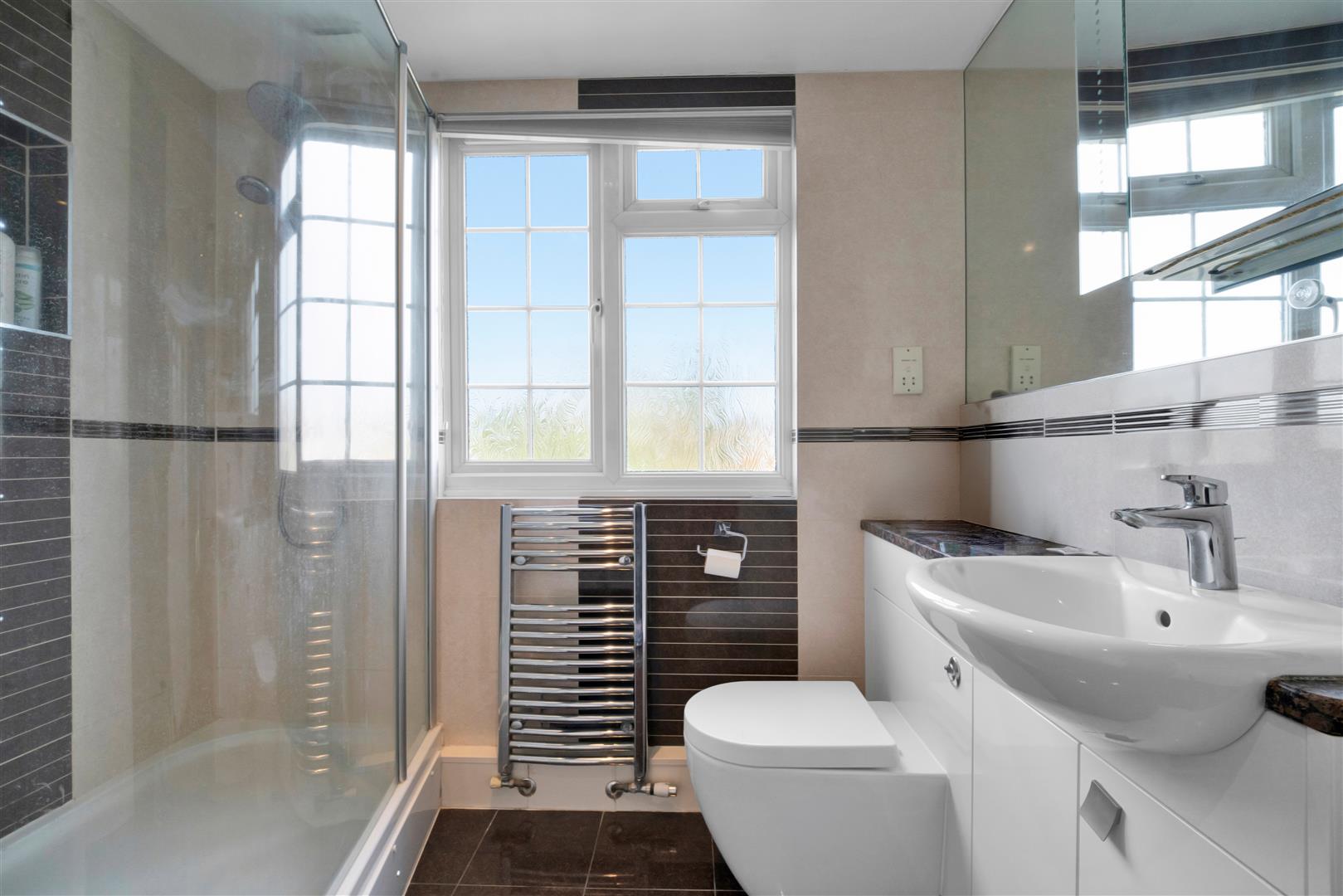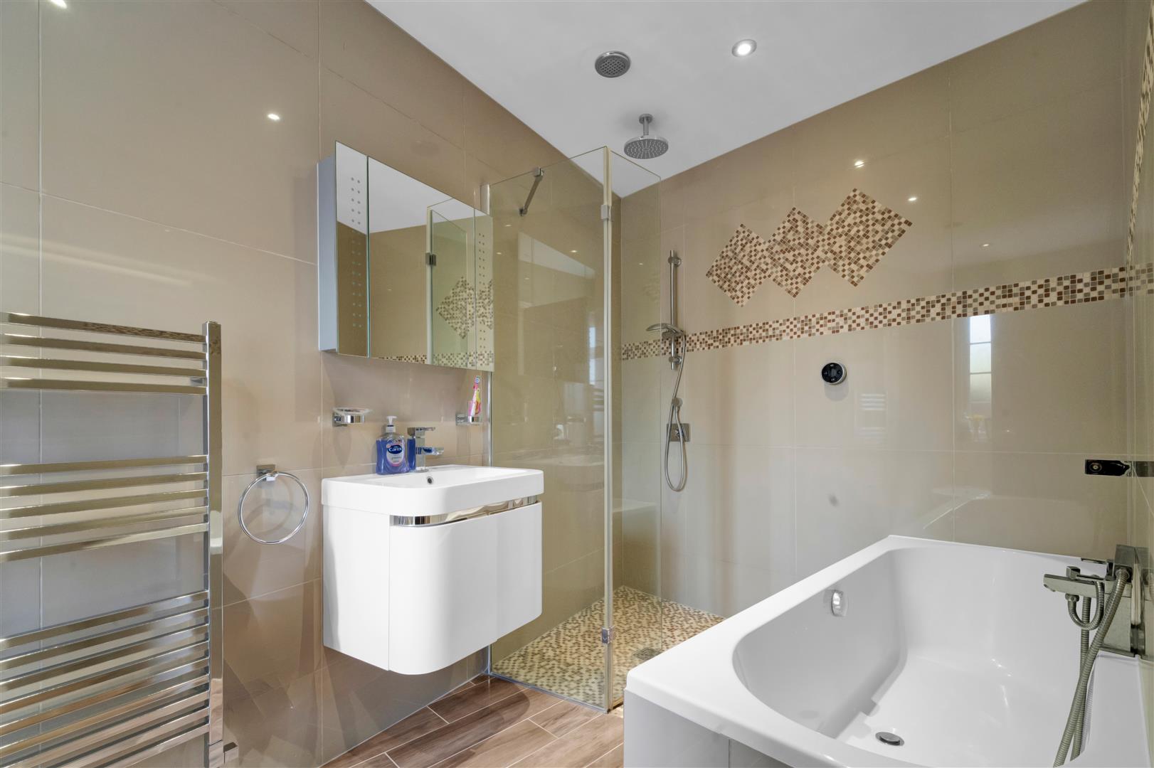 Light and bright en-suite with a matching white bathroom suite comprising of a built in toilet with hand basin, large walk in shower enclosure with thermostatic Mira shower. Down lights, floor to ceiling storage cupboard, tiled floor, mirror, heated towel rail and double glazed window with obscured glass.