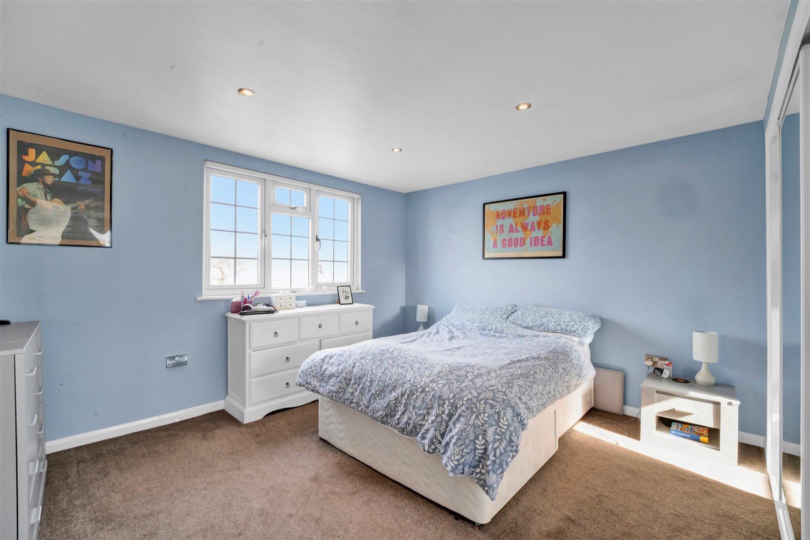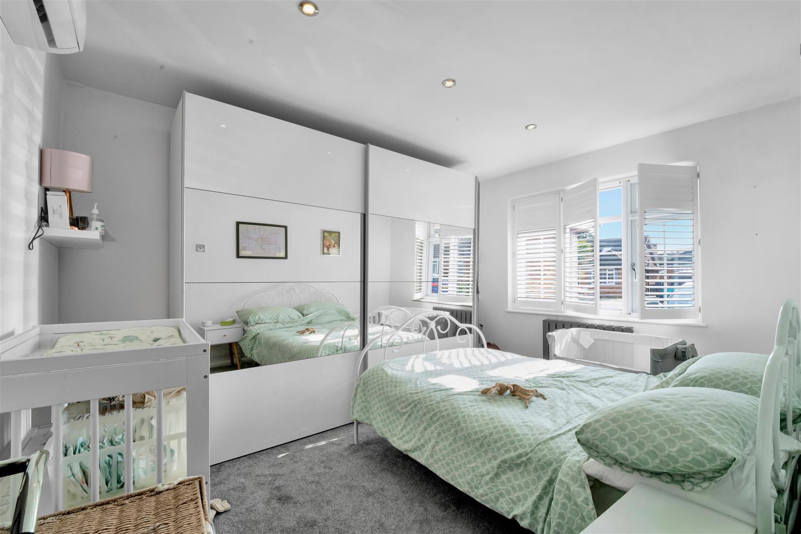 Large double bedroom situated at the front of the property with carpet, radiator, aircon unit, double glazed window with shutter blinds, down lights and space for a large wardrobe and bed.
