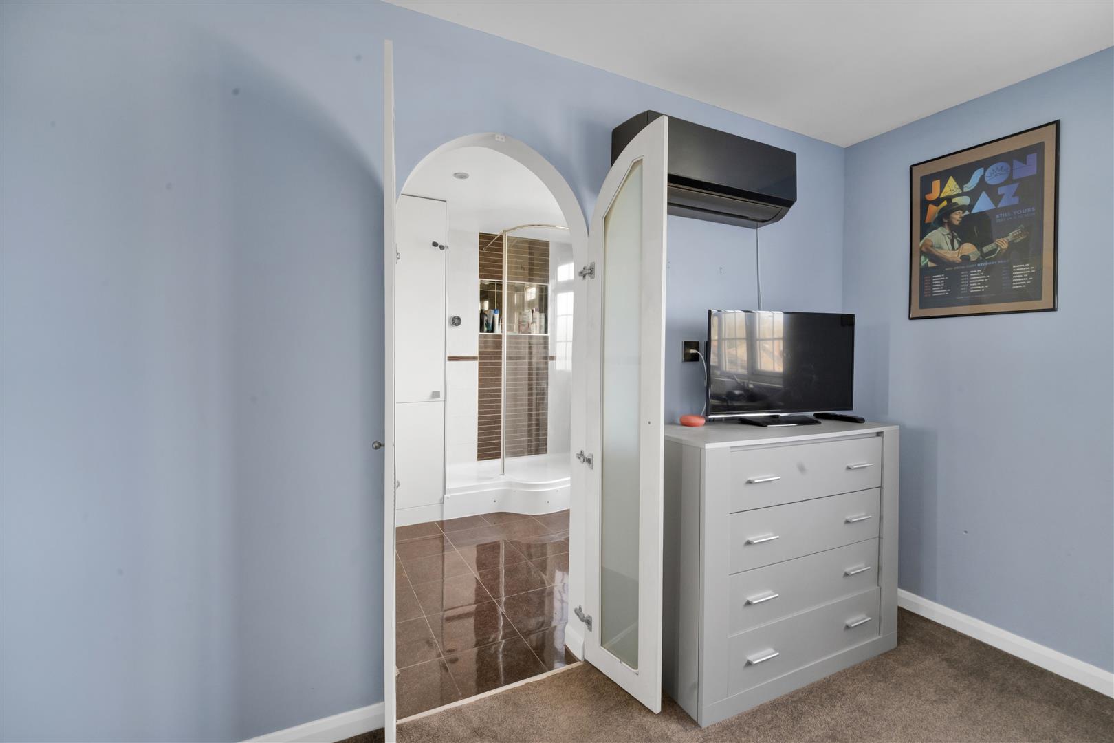 Impressive size double bedroom with mirrored doors leading to a walk in wardrobe with Velux window and further cupboard. Eaves storage, carpet, radiator, double glazed window overlooking the rear garden and arch double doors leading to the en-suite.