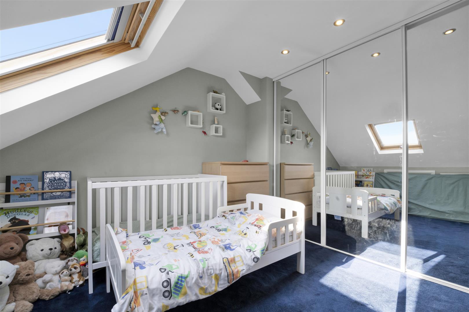 Double bedroom with carpet, wall of mirrored built in wardrobes, down lights, carpet and Velux window.
