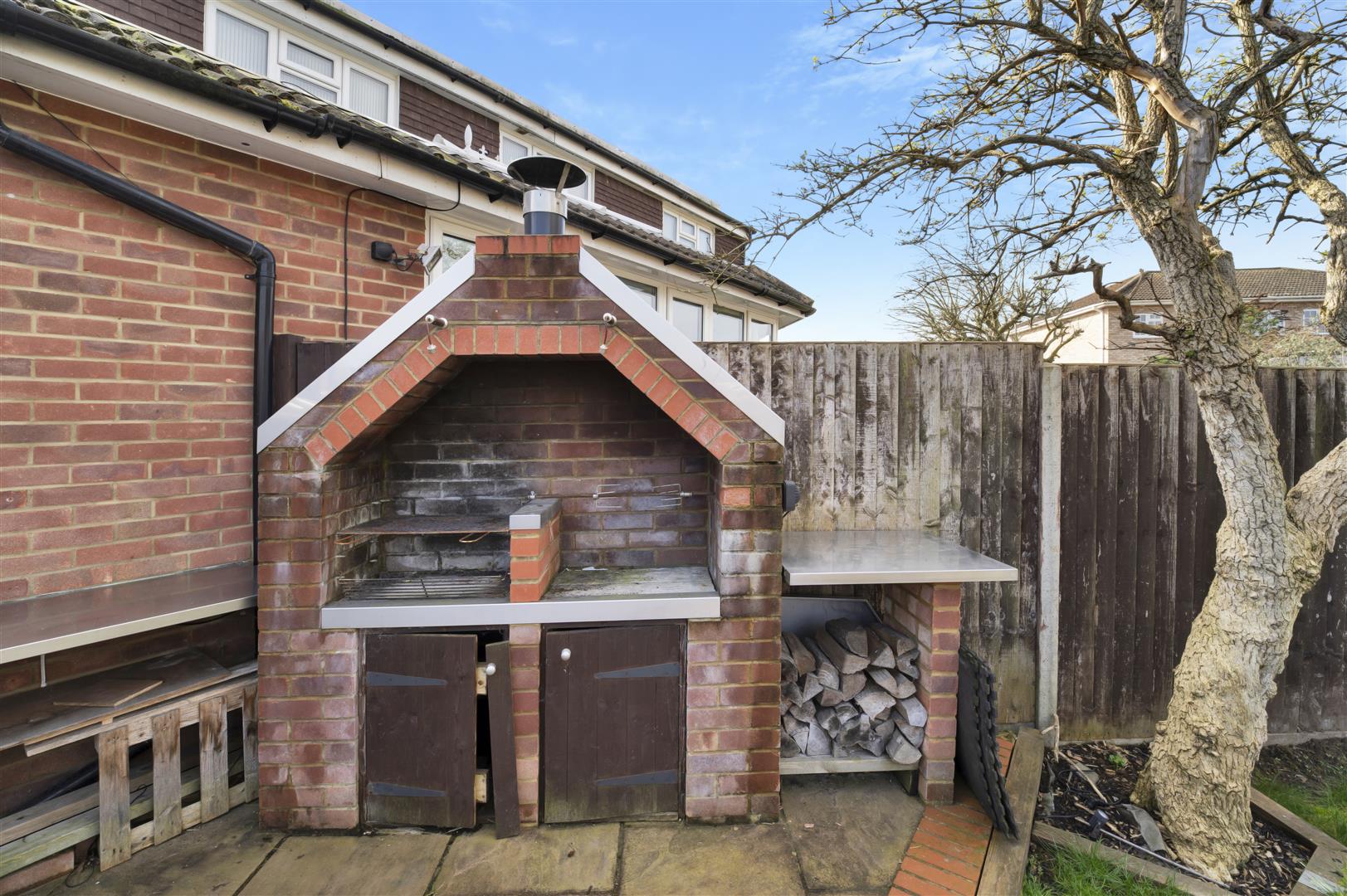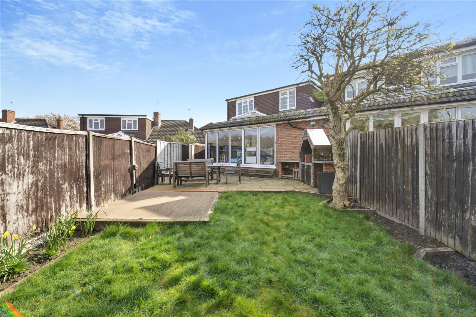 Large patio area leading off the lounge, mostly laid to lawn with decking area, brick BBQ, external sockets and seasonal flowerbeds.
