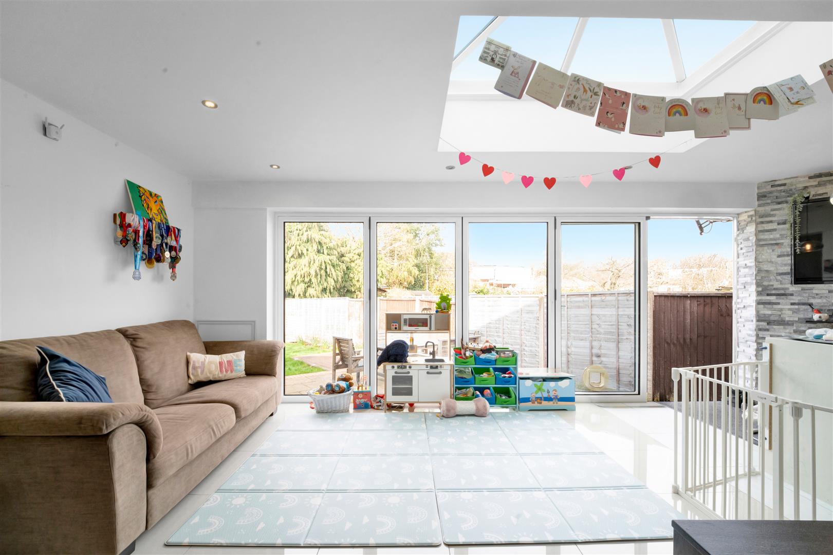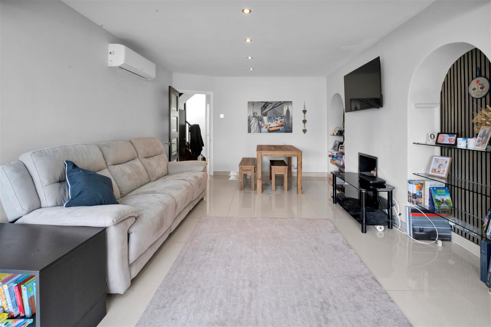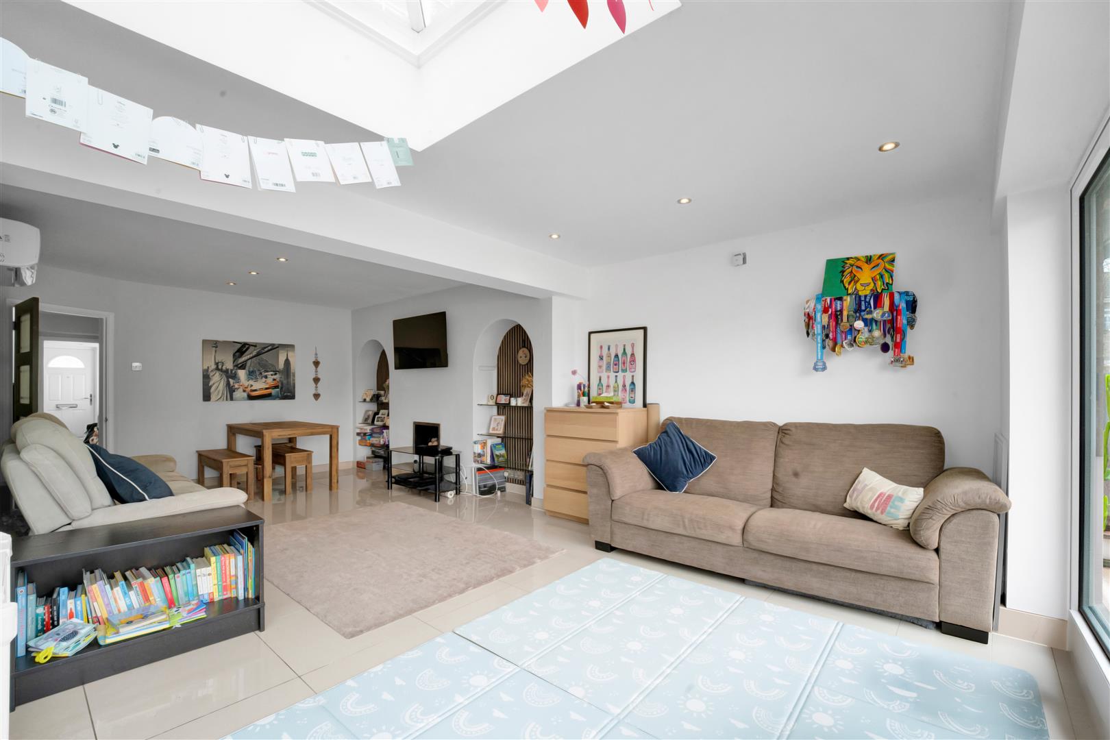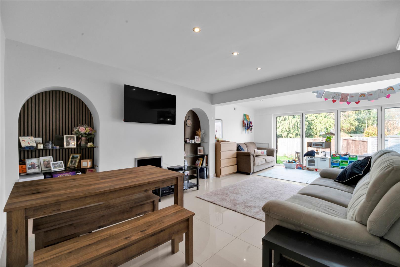 Continuation of the porcelain tiled floor with underfloor heating, this light and bright lounge benefits from a wall of bi-fold doors and superb atrium. Two alcoves with shelves, gas feature fireplace, air conditioning unit, down lights and open plan to the kitchen.