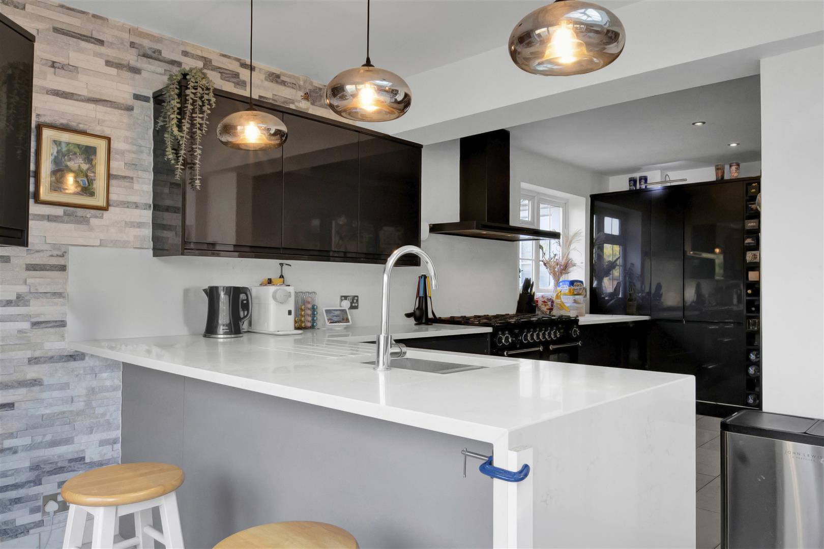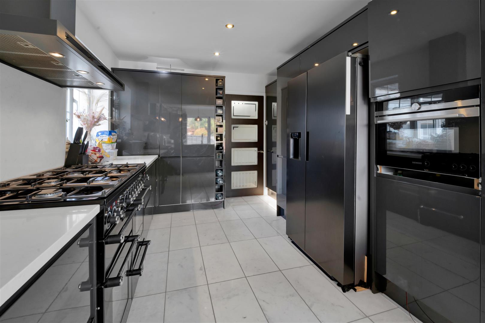 Well designed, spacious kitchen with a range of matching eye and base level cupboards and white granite work top creating a breakfast bar housing the stainless steel sink. Integrated dishwasher, micro oven, extractor fan and space for a dual fuel Rangemaster and wide American fridge/freezer. Porcelain tiles, down lights and side aspect double glazed window.