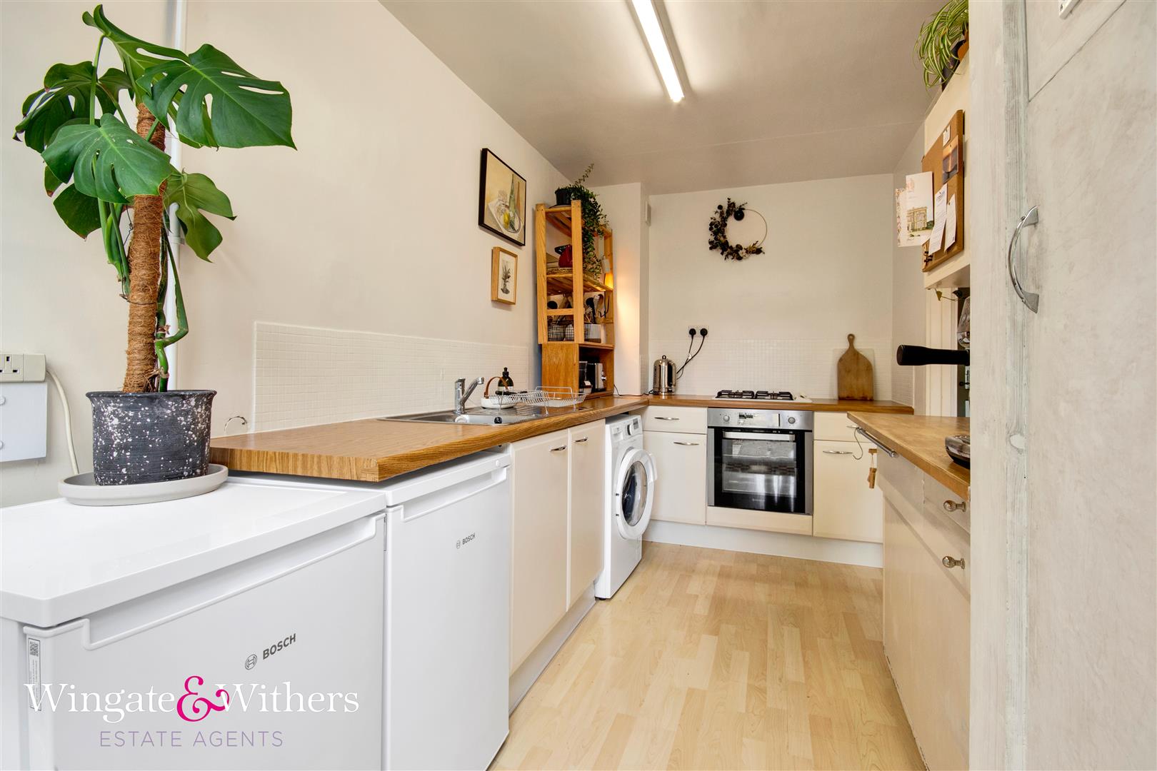 Leading off the dining room, this sunny kitchen benefits from cream base level cupboards, drawers and formica wood effect worktop. Four burner gas hob, electric oven and space for a washing machine and undercounter fridge with seperate freezer. Laminate floor, ceiling strip light and Vaillant combi boiler discreetly positioned in a built in cupboard. Floor to ceiling double glazed door leading to the garden, further side panel window and breakfast bar with solid wood worktop creating further storage/cupboards.
