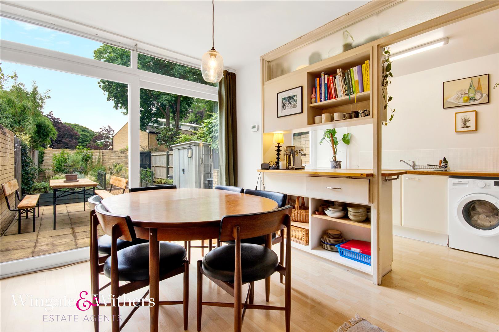 Light and bright dining area with a full width double glazed patio door leading to the garden. Laminate flooring, vertical radiator, central ceiling light and ample space for a dining table and chairs. Opening to the kitchen.