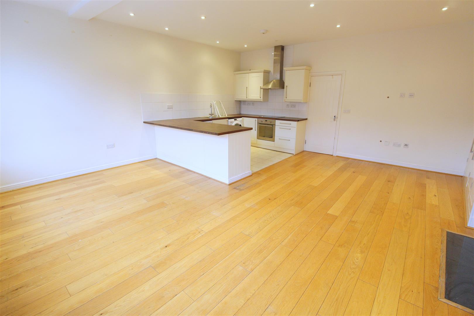 Solid wood floor with built in storage cupboard, down lights and door leading to the open plan lounge/kitchen.