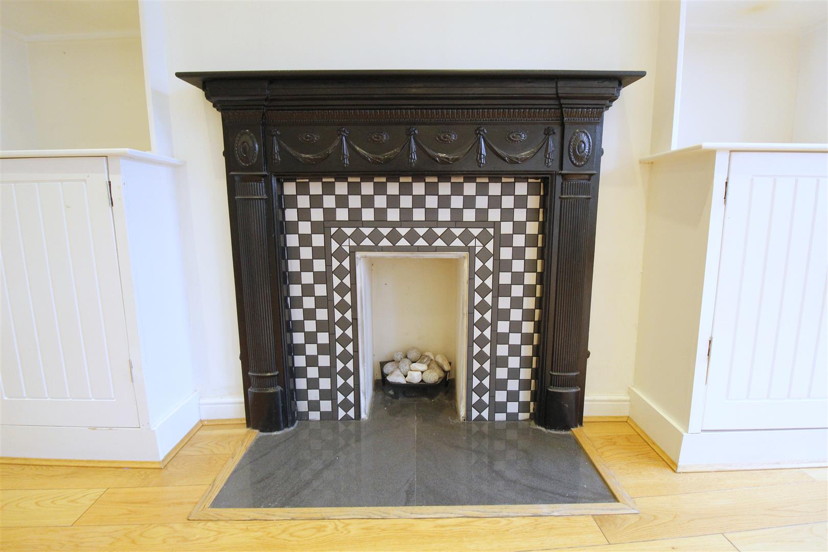 Light and bright lounge with three double glazed sash windows, solid wood floor, storage shelves, tall ceilings, down lights, radiators and ornate fireplace with wood surround. Open plan to the kitchen.